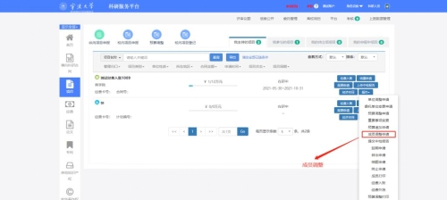 4. 进入项目组成员,请确认成员是否完整。特别是项目中有学生的参与的,请完善学生身份类别。成员信息有问题的,进入科研系统黄色直播,左侧的项目界面,点击操作下拉框下的成员调整申请,进入成员调整界面进行添加和修改,待项目主管审核之后,会自动补充到项目经费公开一览表,最后再提交即可。