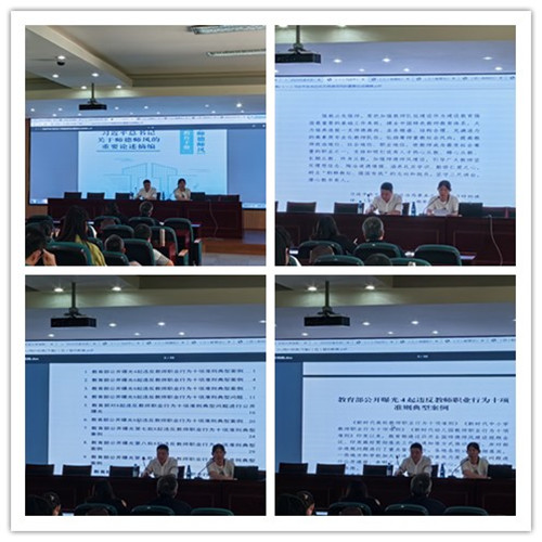 组织“开学师德第一课”,院党委书记童莹娟作宣讲,全体教职工参加了学习。